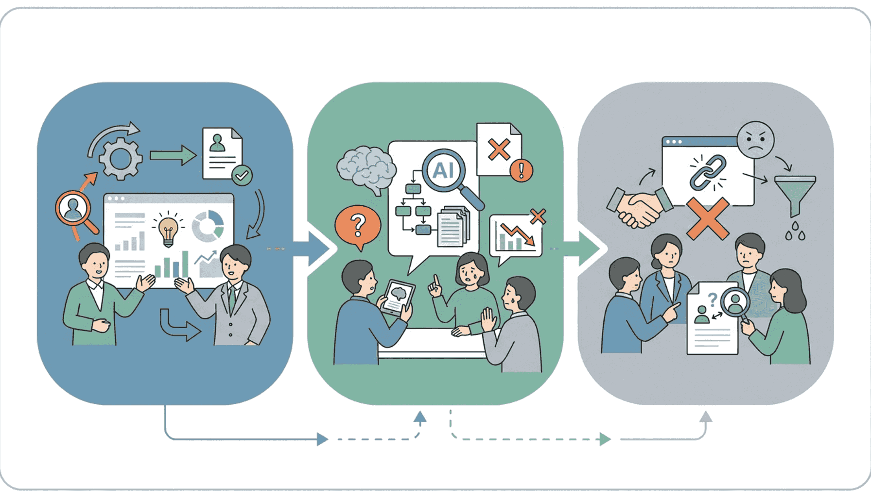 AI面接支援ツールの導入は、候補者とのコミュニケーションにギャップを生む可能性があります。AIが面接の一部を担うことで、候補者は人間のインタビュアーとの直接的な対話が減少し、企業文化や職場の雰囲気を感じ取りにくくなる可能性があるのです。これを防ぐためには、AIによる評価の結果を人間の面接官がフォローアップし、候補者が抱える疑問や不安を解消する機会を設けることが重要です。こうした取り組みによって、候補者に対する企業の透明性と誠実さを示すことができるでしょう。