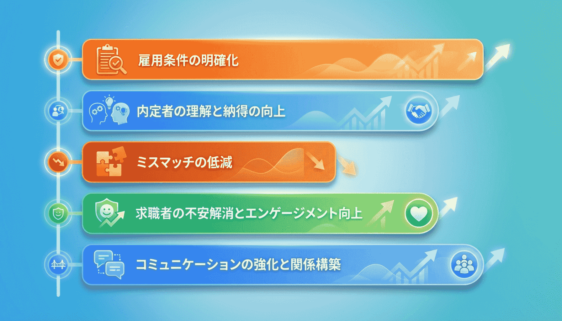 | 不安解消とエンゲージメント向上 | 求職者の不安を解消し、エンゲージメントを高める |